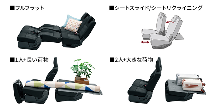 - 標準状態以外のシートアレンジにすると走行できない場合やご注意いただきたい項目がございます。必ず取扱説明書をご覧ください。