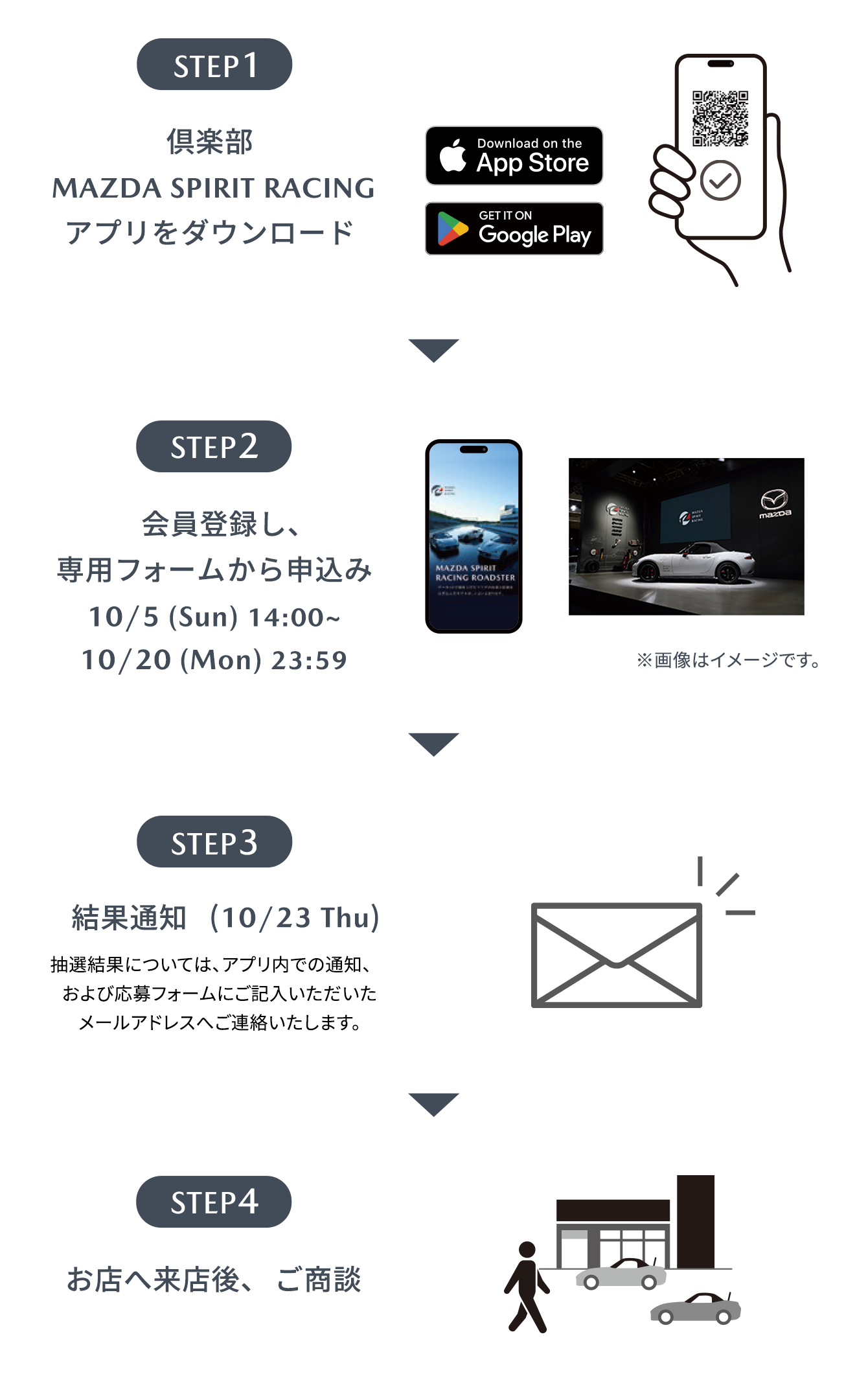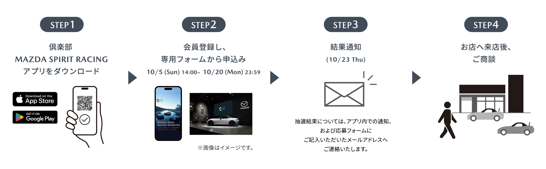 対応可能となる予定の店舗につきましては、10月下旬の商談開始時を目途に本オフィシャルサイト、ならびに倶楽部 MAZDA SPIRIT RACINGアプリにて公開予定です。