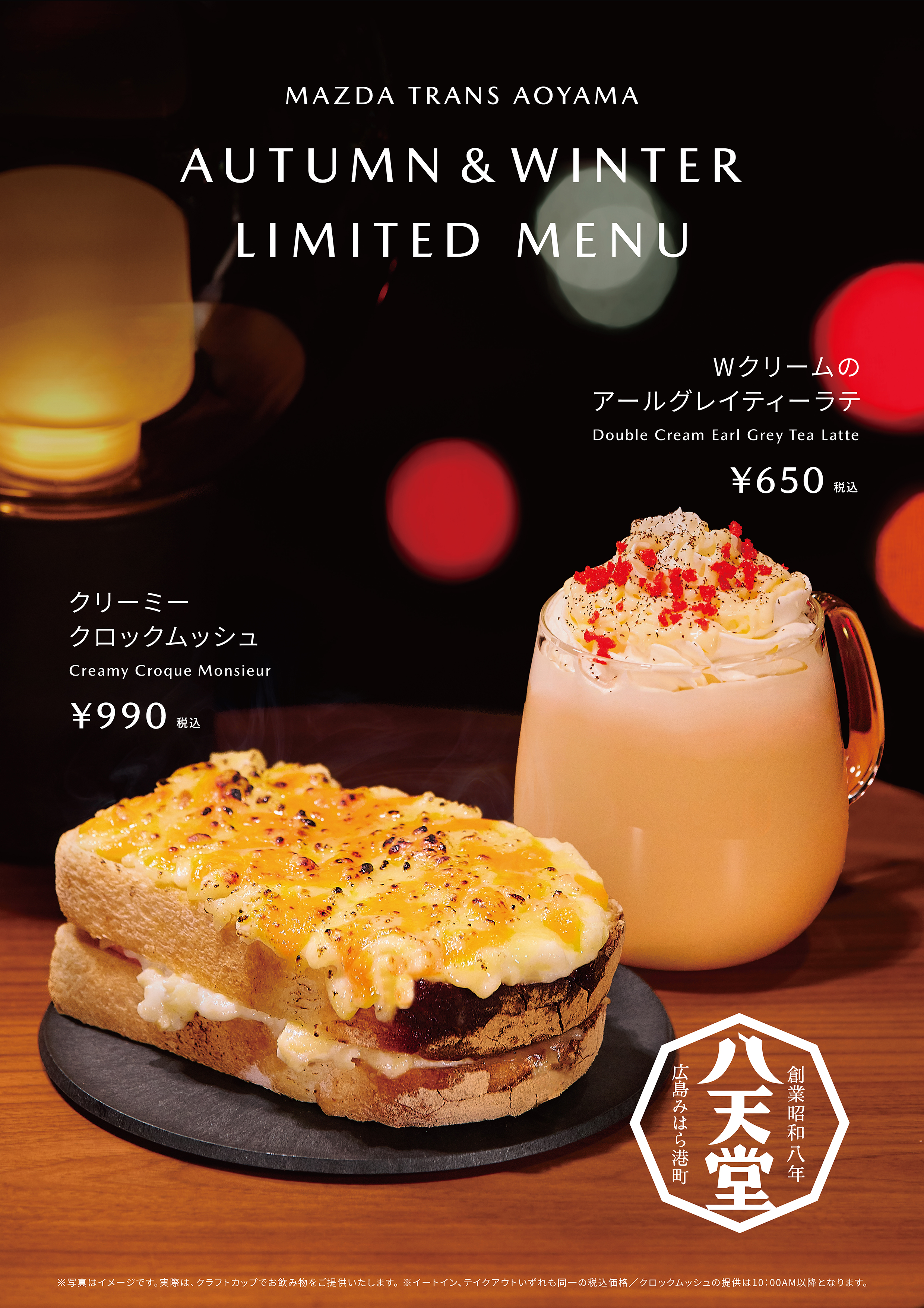 マツダと同じ広島の企業である「八天堂」のカスタードクリームを使用した「クリーミークロックムッシュ」と「Wクリームのアールグレイティーラテ」を、期間限定でご用意。