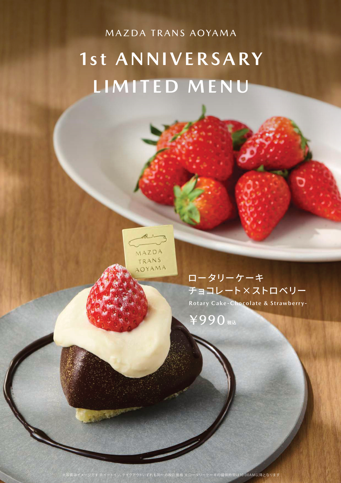 オープン1周年を記念し、ロータリーエンジンの形をモチーフにした「ロータリーケーキ」が登場。濃厚なチョコレートムースケーキに、八天堂のカスタードクリームと旬のいちごを合わせた、ここでしか味わえない限定メニューです。是非ご賞味ください。